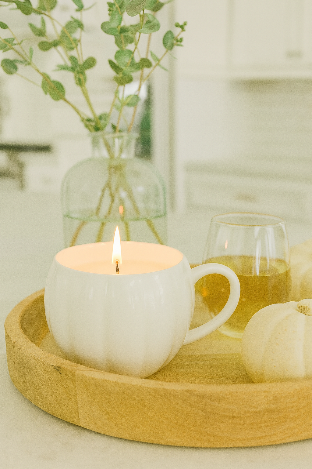 Bring the essence of autumn indoors with our White Pumpkin Mug Candle, hand poured in small batches. This reusable ceramic pumpkin mug is filled with our Falling Leaves fragrance - a rich inviting blend of cedar leaf, spiced apple and warm musk that captures the feeling of crisp fall days.